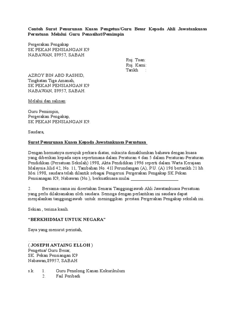 Contoh Surat Penurunan Kuasa Kepada Jawatankuasa Persatuan Pdf